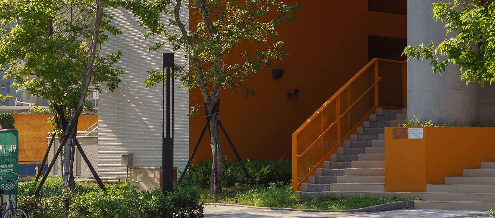 建築主牆採用淺灰色調的鑿面丁掛磚、仿清水模塗料、鋁網,與橘色系塗料形成強烈的對比,讓建築立面的表情更加生動活潑。